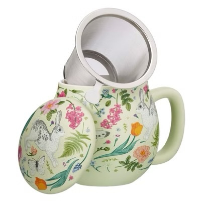 Het zachte kleurenpalet en de bloemenprint geven een rustieke, natuurlijke uitstraling, terwijl de rennende haas op de deksel een speels accent toevoegt.