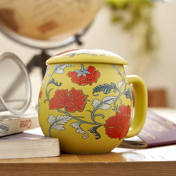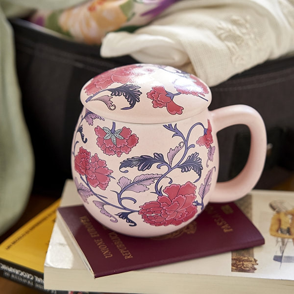 Deze porseleinen mok (350 ml) heeft een weelderige bloemenprint in warme en zachte tinten: roze, mosterd, celadon en ivoor. Het elegante ontwerp en de rijke details maken van iedere slok een kleine beleving.